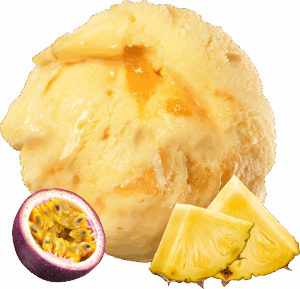 Fräsch och uppfriskande ananas- och passionsfruktssorbet med slingor av syrlig ananas/passionsfruktsrippel. Helt mjölkfri – vegansk.