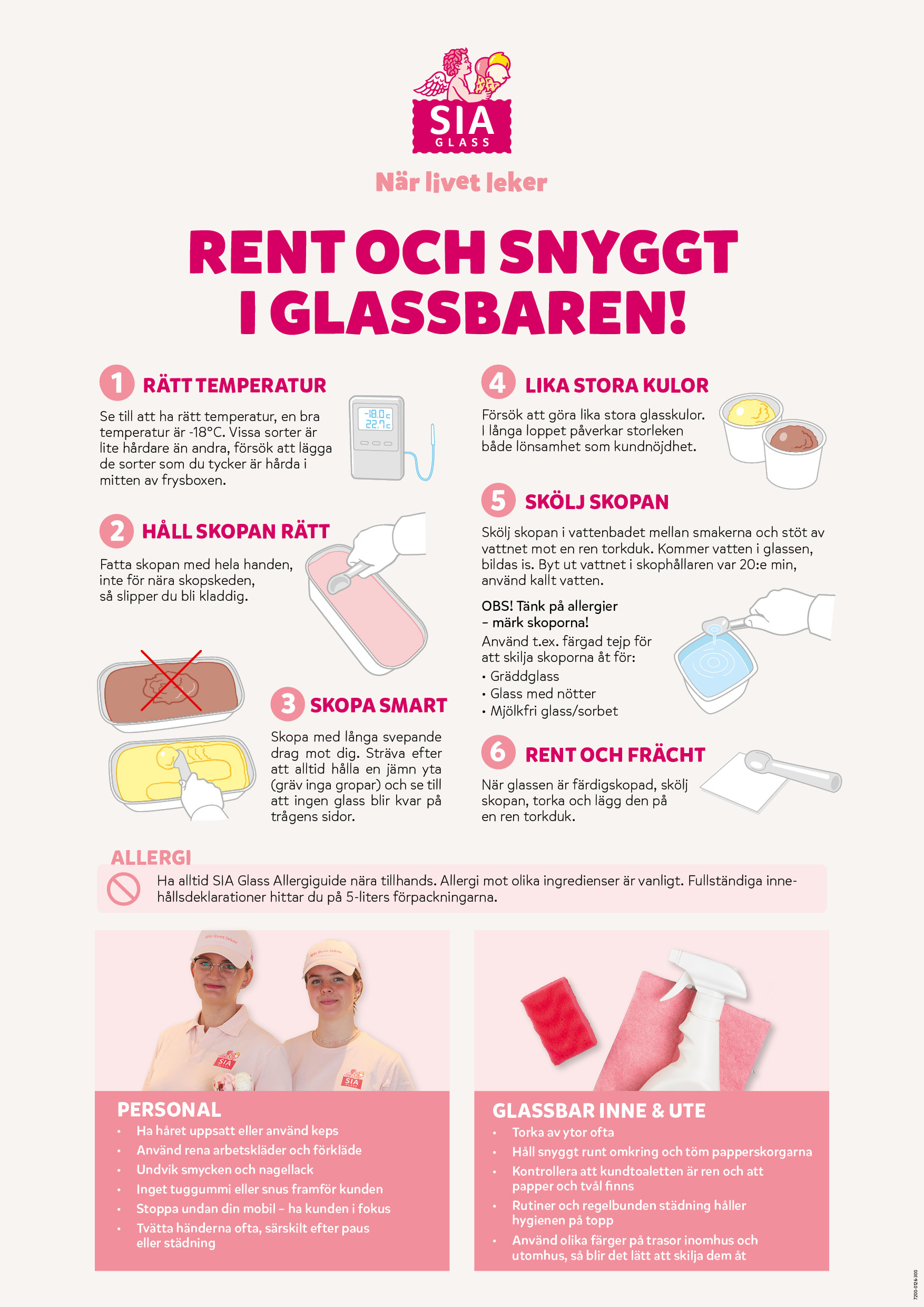 Skölj skopan i vattenbadet mellan smakerna och stöt av vattnet mot en ren torkduk. Kommer vatten i glassen, bildas is. Byt ut vattnet i skophållaren var 20:e min, använd kallt vatten. Tänk på allergier, märk skoporna med t ex färgad tejp för att skilja dem åt: en för gräddglass, en för glass med nötter och en för det mjölkfria sortimentet.