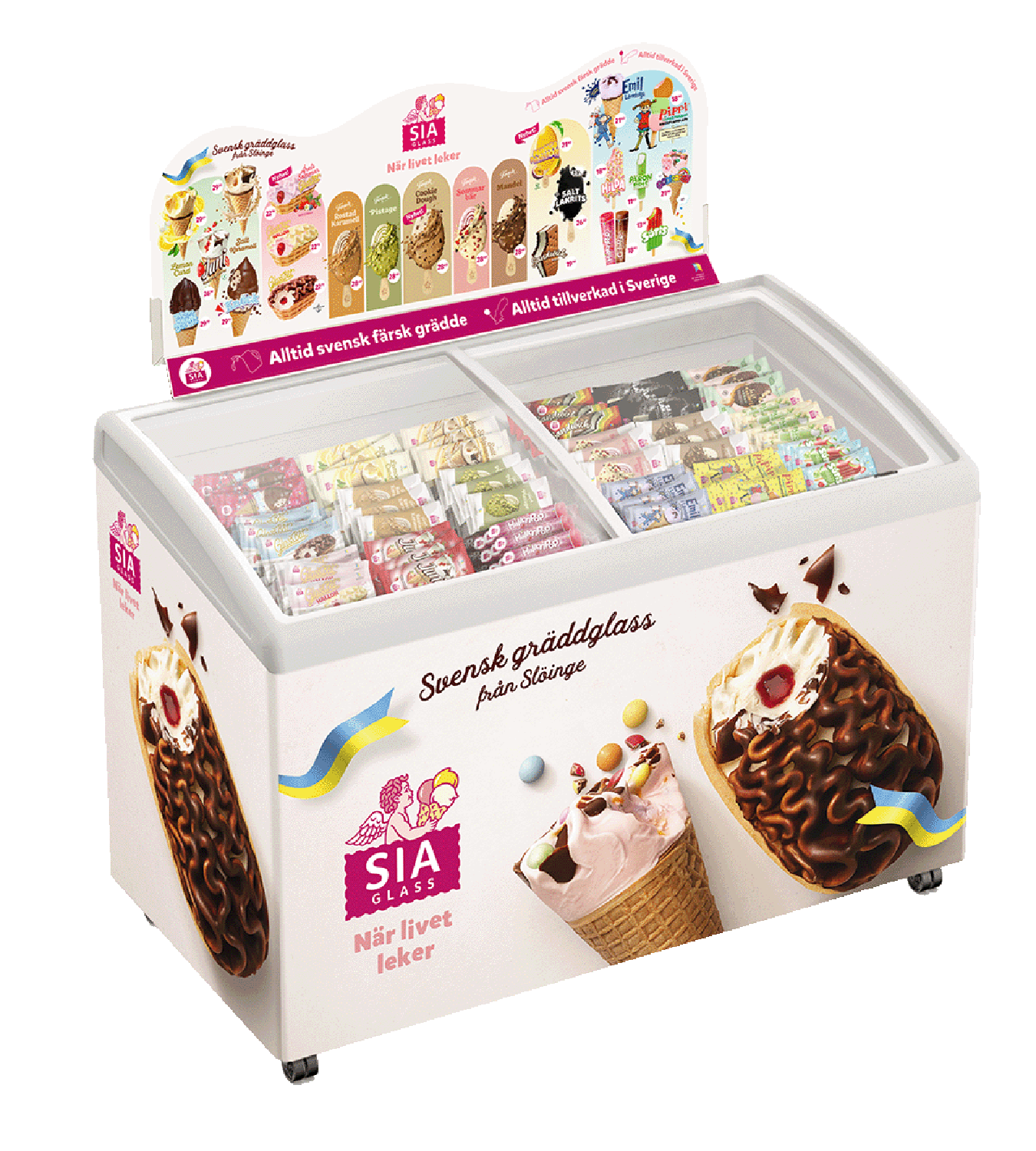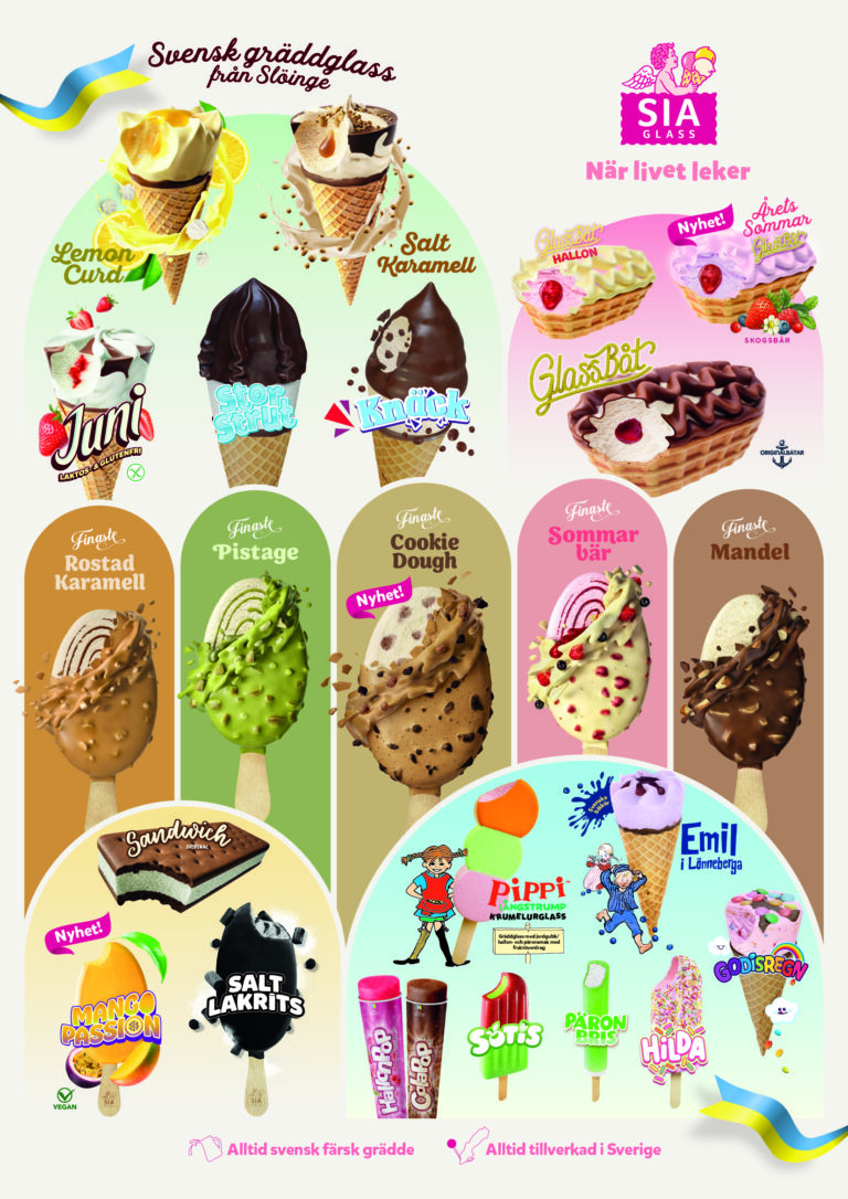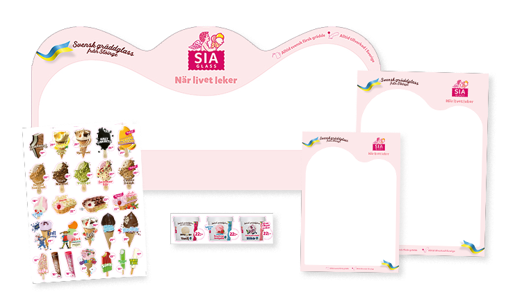 För att öka impulsköp av glass behöver du arbeta med synlighet och tydligt visa att du säljer SIA Glass. Detta gör du enkelt med hjälp av vårt reklammaterial – på flera platser, avstånd och i olika riktningar. Men tänk framför allt på det viktigaste av allt… det personliga mötet mellan dig och kunden!